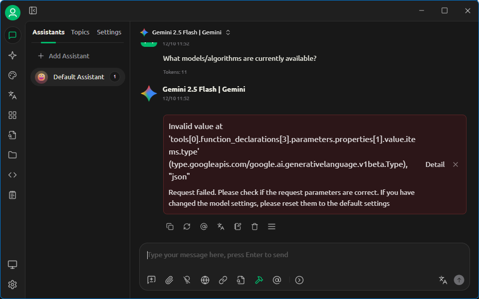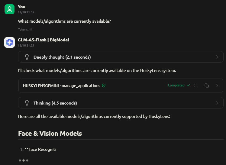 После перезапуска был выбран режим Chat , в качестве модели Gemini выбрана Gemini 2.5 Flash , а в настройках инструментов — сервер MCP HUSKYLENS 2. Затем была протестирована чат-функциональность с использованием команды extract, показанной в обучающей документации: Какие модели/алгоритмы в настоящее время доступны?, но возникли ошибки.