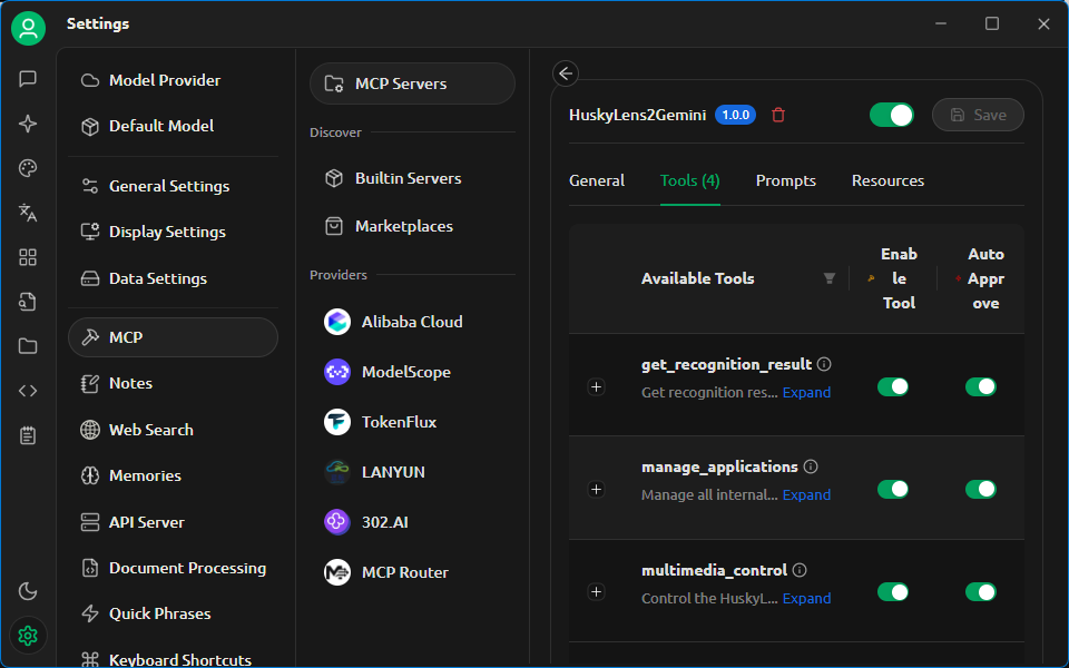 После этого было создано новое подключение к серверу MCP путём установки типа подключения Server-Sent Events (SSE) и точного копирования URL, отображаемого на экране HUSKYLENS 2. После включения появилось четыре новых инструмента, что указывает на успешное подключение к HUSKYLENS 2. Эти четыре инструмента соответствуют перечисленным ниже инструментам MCP: