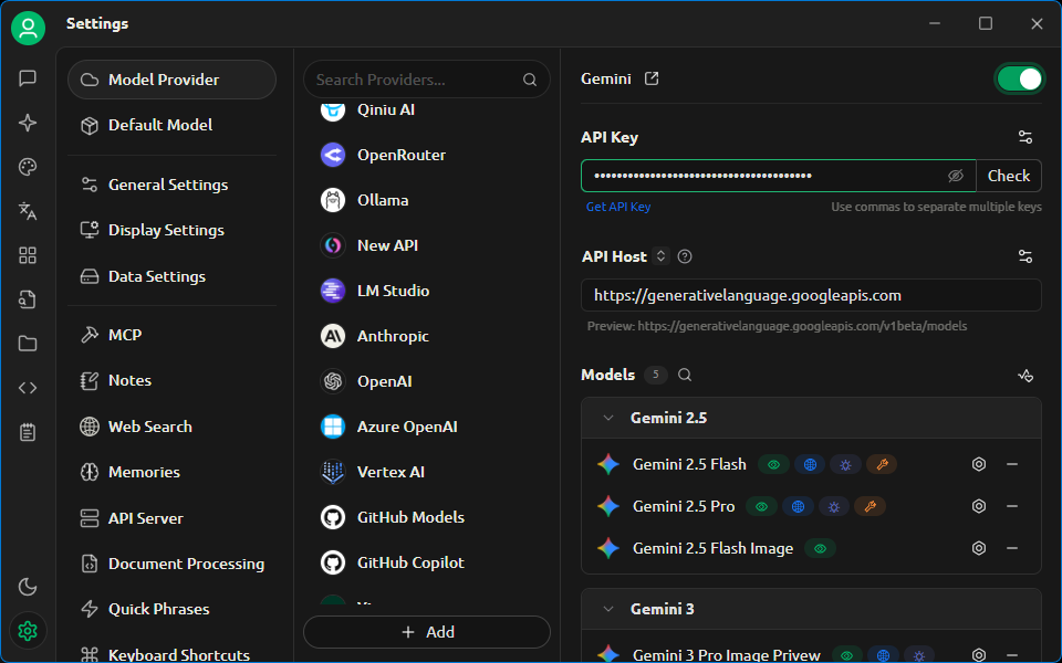 Затем был создан аккаунт Google AI Studio и сгенерирован новый API-ключ. Далее была установлена Cherry Studio версии 1.7.2. В Cherry Studio был выбран провайдер модели Gemini и введён ранее полученный API-ключ. Официальная документация описывает создание новой модели gemini-2.5-flash; однако эта модель уже была доступна в установленной версии Cherry Studio. Поэтому была использована существующая модель gemini-2.5 по умолчанию. Тест подключения прошёл успешно.