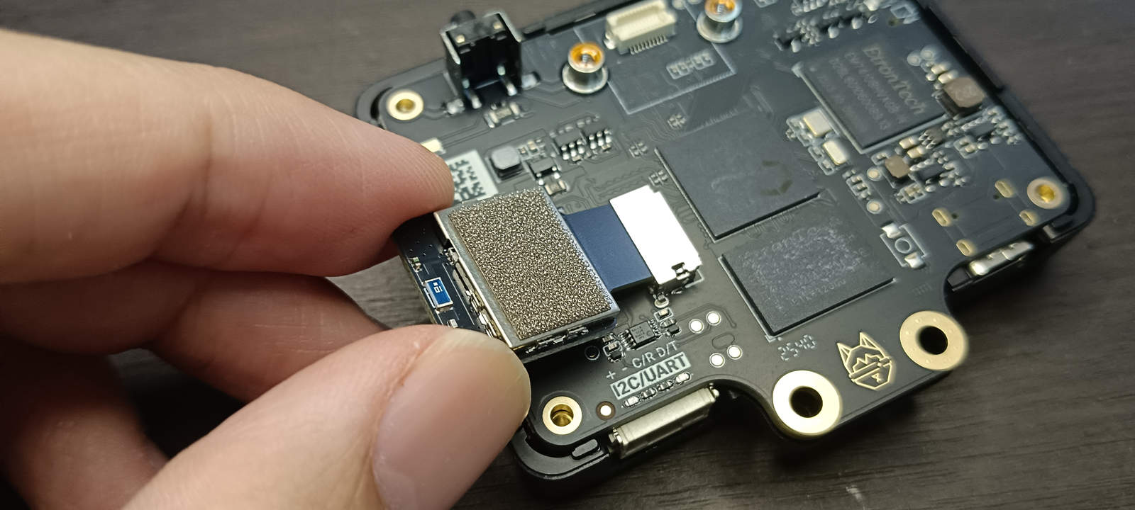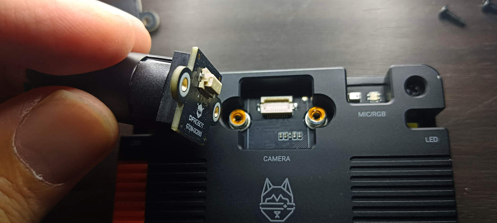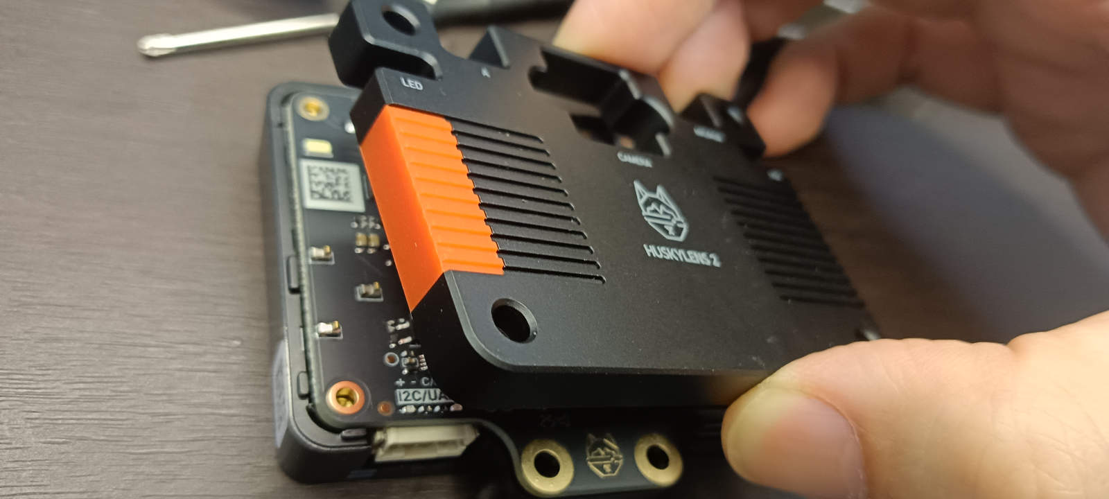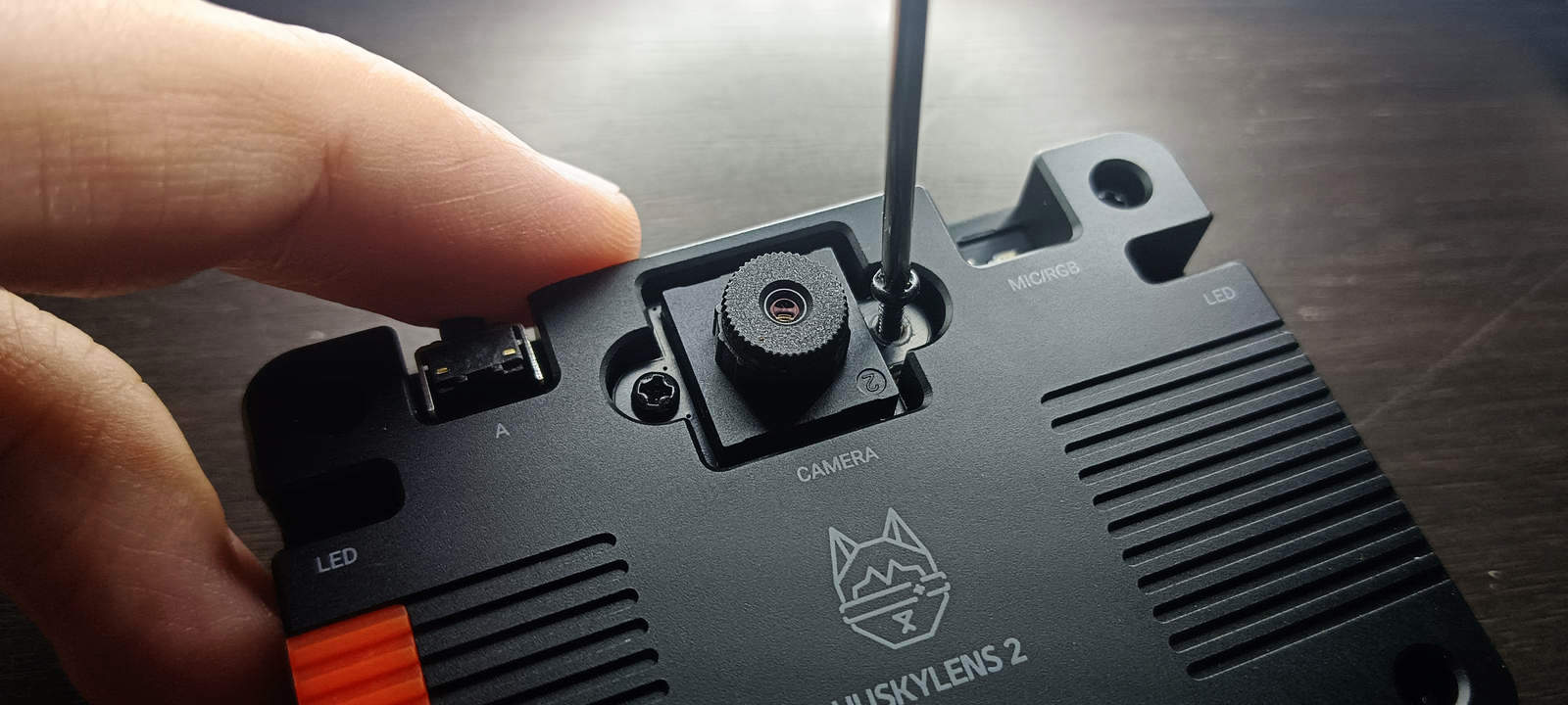 Модуль может быть установлен путём откручивания двух винтов рядом со стандартным модулем объектива камеры и извлечения оригинального модуля камеры. Затем необходимо совместить разъём камеры с гнездом HUSKYLENS 2 и слегка надавить для обеспечения надёжного соединения. После выполнения этих шагов и включения устройства оно корректно отображало изображение с нового объектива.