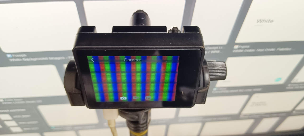 Точно не известно, достигается ли действительно 30-кратное увеличение, но модуль работает хорошо, как показано на следующем изображении, где запечатлён увеличенный вид ЖК-монитора, отображающего белое изображение. Чётко видно расположение красных, зелёных и синих субпикселей. Следует отметить, что изображение на экране HUSKYLENS 2 выглядит слегка размытым, так как модуль немного дрожал во время съёмки.