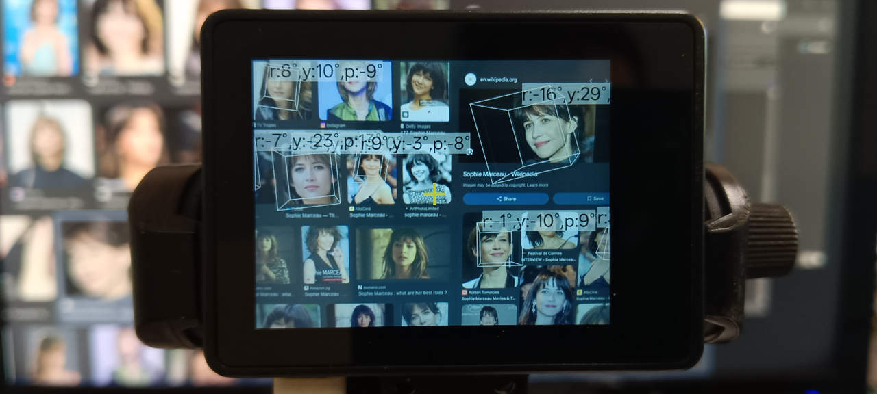 Затем был протестирован порог обнаружения путем уменьшения и увеличения ползунка, и HUSKYLENS 2 реагировал соответствующим образом. Регулировка порога NMS также работала, как и ожидалось. На следующем изображении показаны результаты работы модели распознавания лиц, примененной к сгенерированным ИИ изображениям лиц, отображаемым на LCD-мониторе.