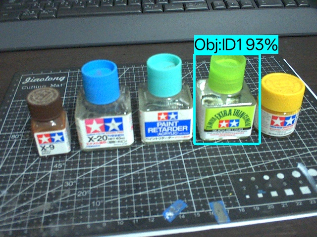 Для выполнения отслеживания объекта сначала была нарисована ограничивающая рамка вокруг целевого объекта. Затем устройство отобразило ограничивающую рамку с идентификатором объекта и оценкой достоверности, например, Obj: ID1 80%, что указывает на первый изученный объект с уровнем достоверности 80%. После этого шага устройство успешно продолжало непрерывно отслеживать объект. На следующих изображениях показаны прямые скриншоты результатов отслеживания объектов. Этот режим был протестирован с использованием нескольких бутылок масштабных моделей TAMIYA, причем зеленая бутылка была выбрана в качестве целевого объекта. Затем камера произвольно перемещалась так, что целевой объект выходил из поля зрения, а позже возвращался в кадр; HUSKYLENS 2 по-прежнему корректно повторно обнаруживал целевой объект. Кроме того, объект можно было без проблем отслеживать под несколькими углами обзора, при условии, что разница в угле была не слишком велика.