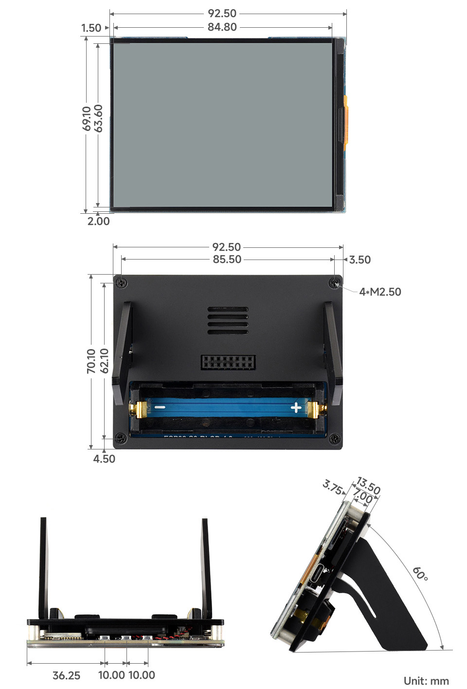 - Общий размер – 92,5 × 70,1 x 13,5 мм (Ш × В × Г, вид спереди и сбоку)