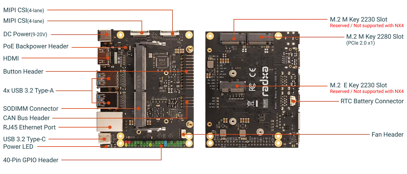 Системный модуль Radxa NX4 может использоваться с базовой платой NX4 IO, которая предоставляет доступ к видеовыходу HDMI, двум 4-канальным камерам MIPI CSI, портам USB 3.2 (четыре Type-A и один Type-C), гигабитному Ethernet с опциональным PoE и слоту M.2 M-Key 2280 для NVMe SSD. Плата также имеет 40-контактный заголовок GPIO с распространенными последовательными интерфейсами, а также заголовки для вентилятора, батареи RTC, шины CAN, кнопок и PoE, все питается от разъема питания типа barrel jack с поддержкой входного напряжения 9–20 В постоянного тока.