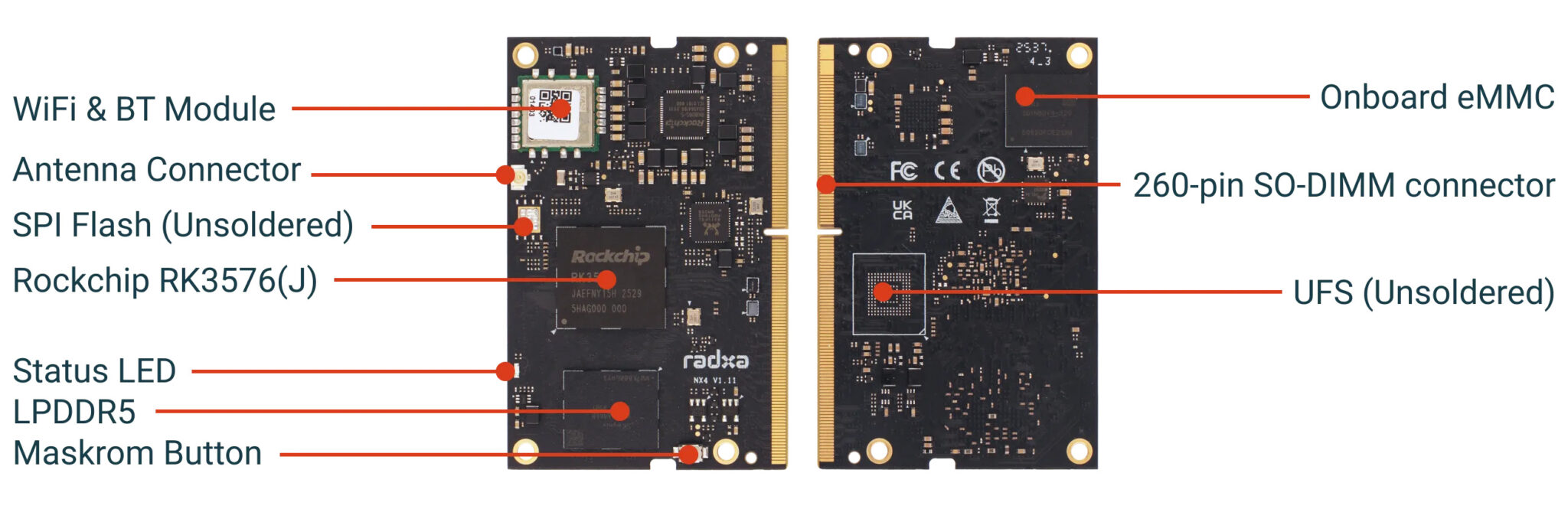 Ранее Radxa использовала RK3576J на SoM Radxa CM4 и одноплатном компьютере Radxa ROCK 4D , также были публикации о GrapeRain GR3576_CV2 — еще одном SoM на базе RK3576, использующем такой же 260-контактный разъем SO-DIMM. Однако маловероятно, что эти две платы совместимы друг с другом контакт-в-контакт.