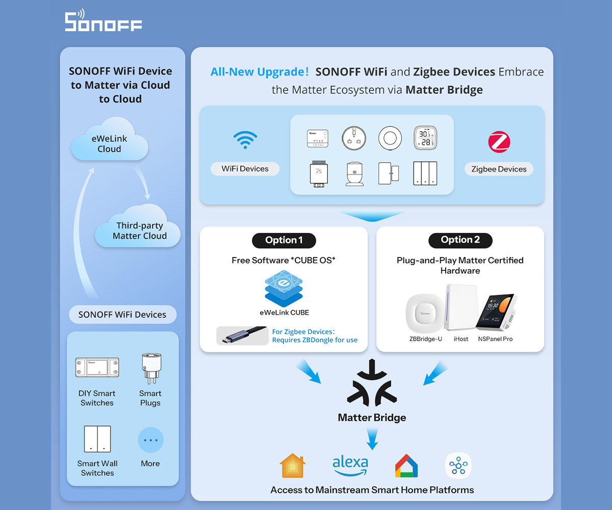 Все устройства для домашней автоматизации SONOFF WiFi и Zigbee теперь могут работать с протоколом Matter. Это можно сделать двумя способами: