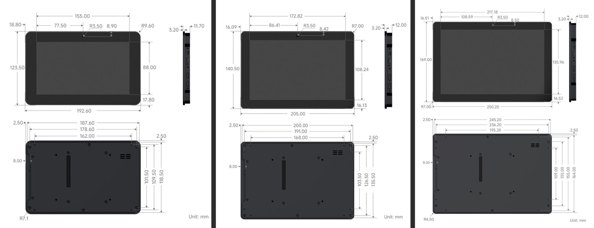 - 8-дюйм – 205.0 × 140.5 × 12.0 мм (Общие); 172.82 × 108.24 мм (Активная область дисплея)