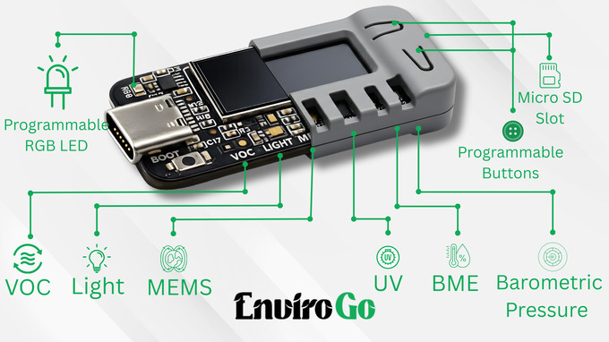 EnviroGo поддерживает встроенные подключения Wi-Fi и Bluetooth через WiSoC ESP32-S3, оснащен небольшим 0,96-дюймовым IPS-дисплеем, слотом для карт microSD для локального ведения журналов данных и часами реального времени (RTC) для записи с метками времени. Устройство собирает данные с настраиваемыми интервалами, использует RGB-светодиоды и зуммер для визуальных и звуковых оповещений, а также может обрабатывать данные локально с использованием прогнозирования на базе ИИ для выявления тенденций, таких как рост уровня ЛОС или изменения влажности (с заявленным 7-дневным периодом обучения). EnviroGo предназначен для разработчиков IoT, исследователей, пользователей умного дома и людей, заботящихся о здоровье, которые хотят долгосрочного отслеживания состояния окружающей среды и ранних предупреждений, а не только показаний в реальном времени.