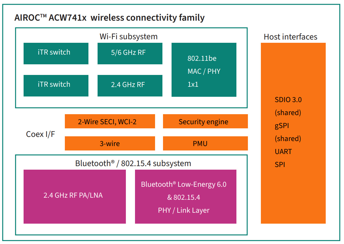 Infineon представила семейство беспроводных однокристальных систем AIROC ACW741x с трехдиапазонным Wi-Fi 7, разработанное для IoT устройств и устройств умного дома. Компания отмечает, что это первое решение Wi-Fi 7 с радио Wi-Fi 7 «20 MHz» 1×1, Bluetooth 6.0 (включая Channel Sounding) и радио 802.15.4 для поддержки Thread и Matter в корпусе QFN размерами 7×7 мм.