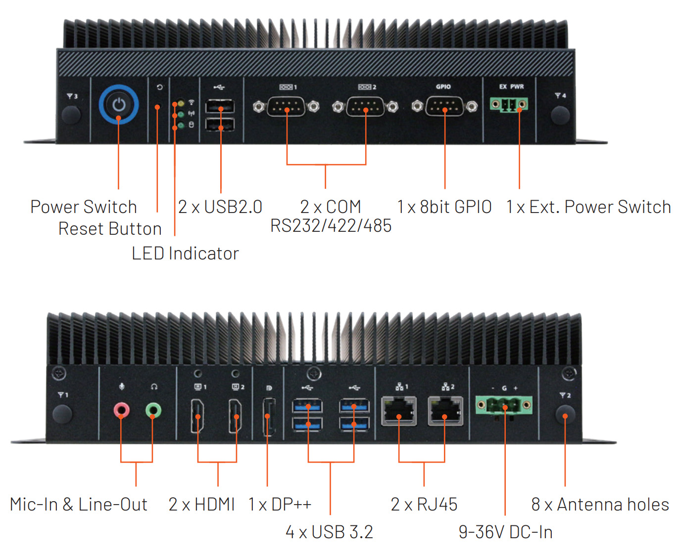Система поддерживает до 64 ГБ оперативной памяти DDR5-6400 через два слота SO-DIMM, накопитель NVMe SSD через сокет M.2 Key-M, а также беспроводную или сотовую связь через слоты M.2 Key-E и Key-B с поддержкой SIM. Кроме того, она оснащена двумя портами 2.5GbE, несколькими портами USB 3.2 и USB 2.0, двумя последовательными интерфейсами RS-232/422/485, 8-битным GPIO и тройным выводом изображения 4K через DisplayPort 1.4 и два HDMI 2.0b. Поддерживается широкий диапазон входного напряжения 9-36 В постоянного тока, интерфейс расширения IET (подробности ниже) и бесшумная конструкция для эксплуатации в жестких условиях на периферии.