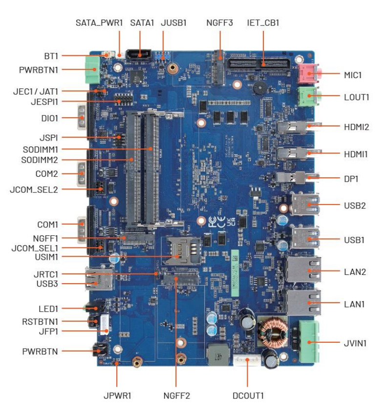 Компания предоставила изображение внутренней материнской платы со всеми отмеченными интерфейсами и разъемами, на котором виден интерфейс IET (Intelligent Expansion Technology), расположенный у края платы, а также размещение слотов M.2 Key-B и Key-E вместе с различными джамперами, сокетом для SIM-карты и многим другим, что дает гораздо лучшее понимание модели.