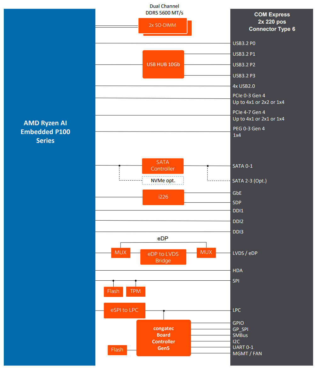 - AMD Ryzen AI Embedded P121 – 4-ядерный/8-поточный процессор Zen 5 с частотой до 4.4 ГГц, кэш-память 4 МБ L2 и 8 МБ L3, 2 вычислительных блока RDNA3.5 графики @ 2700 МГц; TDP: 28 Вт/54 Вт (турбо); NPU: 30 TOPS