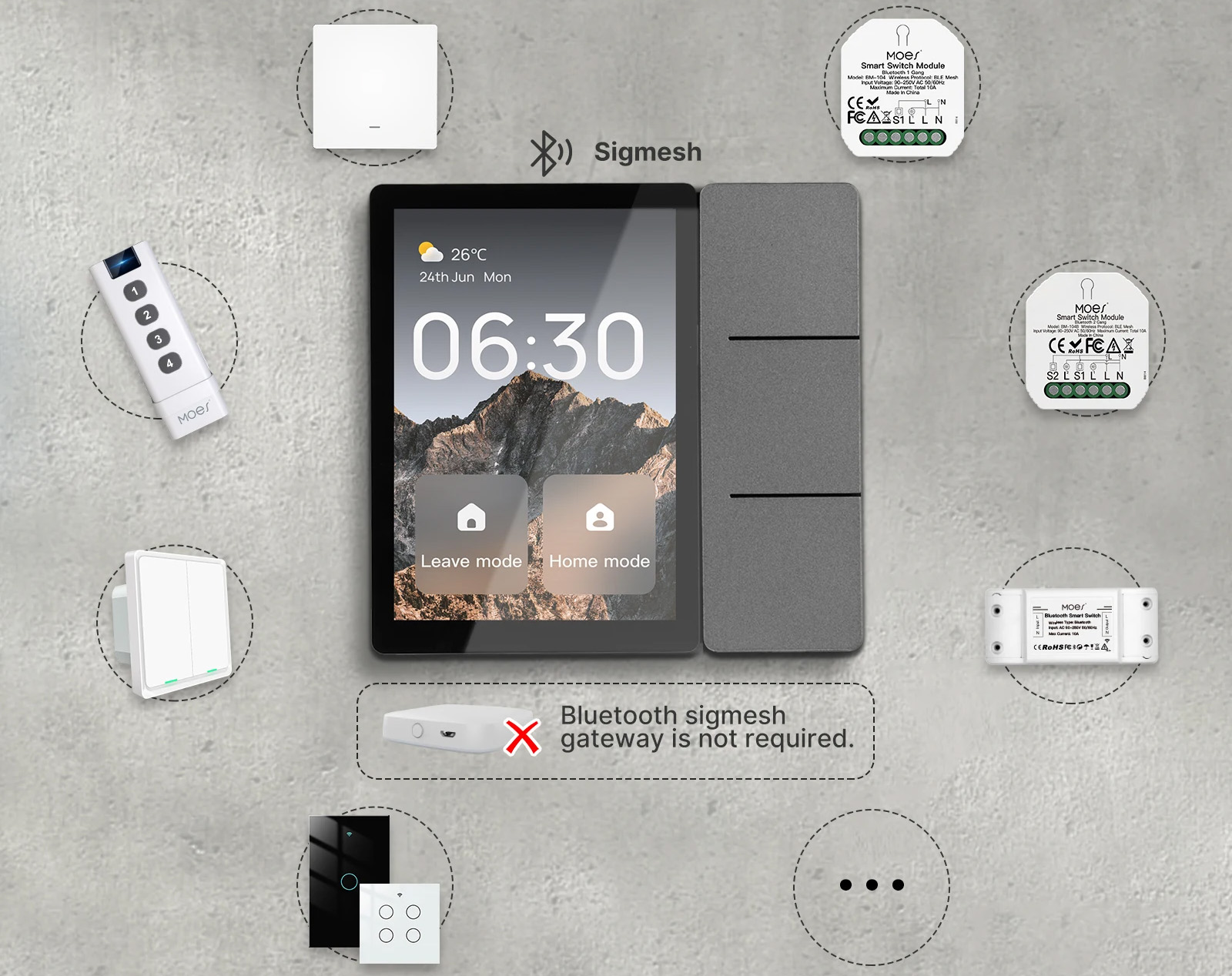 Устройство поддерживает до 128 подчиненных устройств Bluetooth «Sigmesh» через встроенный шлюз Bluetooth Mesh и может управлять до 200 умными устройствами в экосистеме Tuya. Управление устройствами возможно с помощью локального релейного управления, 3.5-дюймового сенсорного интерфейса, трех физических кнопок или мобильного приложения ( Tuya или MOES ). Также поддерживается просмотр живого видео с совместимых умных камер и видеодомофонов, а также управление с экрана и разблокировка поддерживаемых умных замков. Голосовое управление доступно через Amazon Alexa с использованием умной колонки Alexa, а функция зонирования позволяет настроить панель для управления одной комнатой, несколькими комнатами или всем домом.