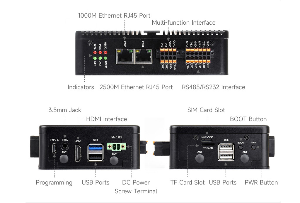 Waveshare IPCBOX-CM5 — это промышленный мини-компьютер на базе Raspberry Pi CM5, оснащенный клеммными колодками для RS485, RS232, CAN Bus и дискретных вводов/выводов, двумя портами Ethernet, слотом M.2 для накопителей NVMe или AI-акселераторов и широким диапазоном входного питания постоянного тока от 7 до 36 В.