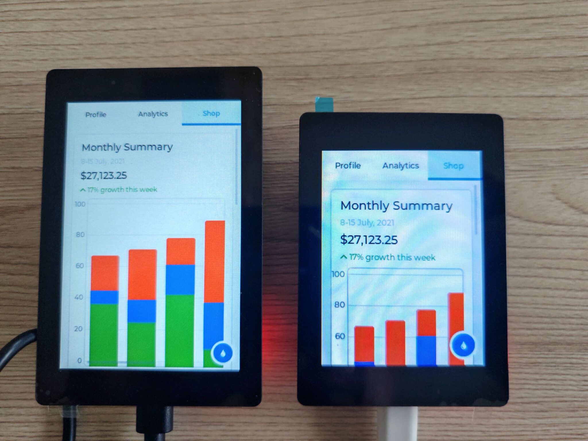 После первого включения плат (перед тестированием части с Arduino), экран сразу же отображает демо виджетов LVGL. Как 3.5-дюймовая, так и 2.8-дюймовая версии нормально отображают интерфейсы, с хорошим уровнем цвета и яркости, которые чётко видны под большинством углов обзора. Ёмкостное касание реагирует хорошо, проблем не наблюдается. Однако при сравнении цветов явно заметно, что ONX2432G028 (2.8″) имеет заметно более яркие и насыщенные цвета по сравнению с 3.5-дюймовой моделью.