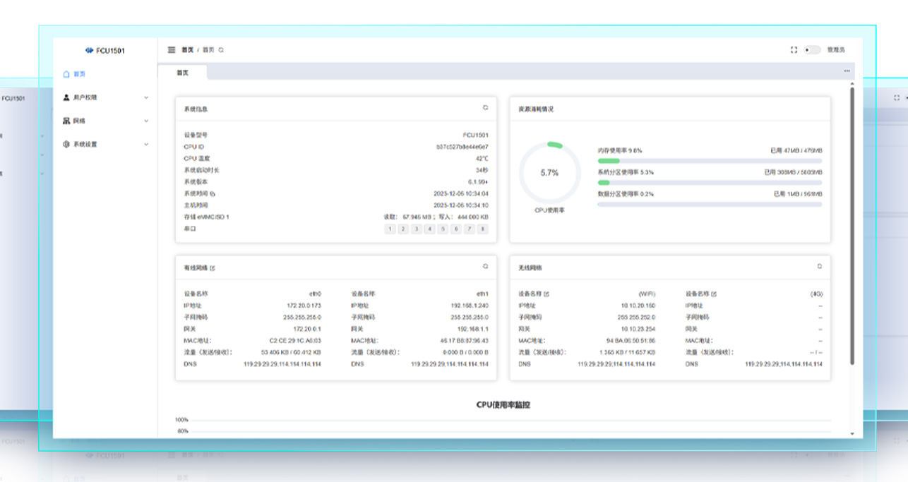 Информация о программном обеспечении ограничена, компания лишь упоминает, что FCU1501 работает на ядре Linux 6.1 и предустановлены промышленные протоколы и промежуточное ПО, включая Modbus (преобразование и сквозная передача TCP/RTU), TCP/IP, SSH, OpenVPN, Nginx и поддержку обратного прокси.