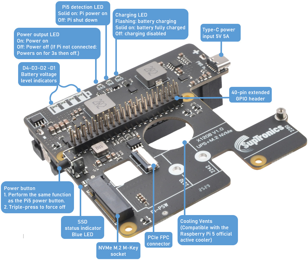 Плата получает до 5В/5А от порта USB-C, что заряжает литий-ионный аккумулятор размера 21700 (1.5А) и питает Raspberry Pi 5 напрямую через 40-контактный GPIO-разъём, устраняя необходимость в дополнительных кабелях. Она также оснащена слотом M.2 с ключом M для NVMe SSD форматов 2230/2242/2280 объёмом до 4ТБ со скоростями PCIe 2.0/3.0. Источник бесперебойного питания поддерживает переключение питания, автоматическое включение, безопасное выключение при низком заряде батареи и управление питанием/зарядкой через GPIO, а также обнаружение потери питания. Плата X1208 также оборудована I2C-чипом мониторинга заряда Maxim для контроля напряжения и ёмкости аккумулятора.